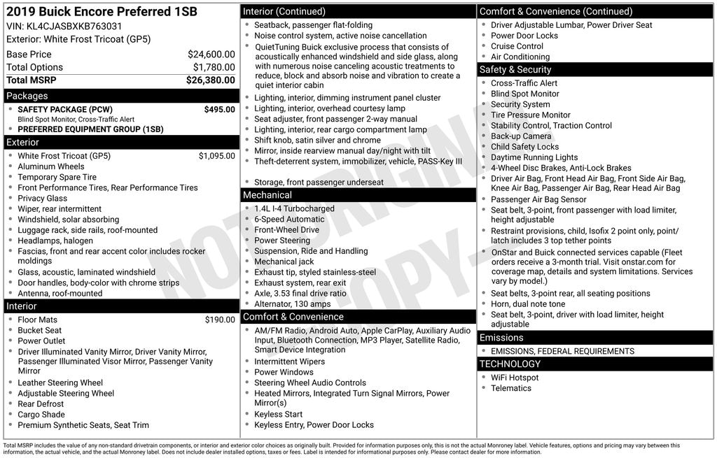 120-Volt Power Outlet, 2-Way Manual Front Passenger Seat Adjuster, 3.53 Final Drive Axle Ratio, 4-Wheel Disc Brakes, 6 Speakers, 6-Speaker Audio System, 6-Way Power Driver Seat Adjuster, ABS brakes, Air Conditioning, Alloy wheels, AM/FM radio: SiriusXM, Apple CarPlay/Android Auto, Brake assist, Bumpers: body-color, Cloth w/Leatherette Seat Trim, Compass, Delay-off headlights, Driver door bin, Driver vanity mirror, Driver's Seat Mounted Armrest, Dual front impact airbags, Dual front side impact airbags, Electronic Stability Control, Emergency communication system: OnStar and Buick connected services capable, Exterior Parking Camera Rear, Front anti-roll bar, Front Bucket Seats, Front reading lights, Front wheel independent suspension, Fully automatic headlights, Heated door mirrors, Illuminated entry, Knee airbag, Low tire pressure warning, Occupant sensing airbag, Outside temperature display, Overhead airbag, Panic alarm, Passenger door bin, Passenger vanity mirror, Power door mirrors, Power driver seat, Power steering, Power windows, Preferred Equipment Group 1SB, Premium All-Weather Floor Liners (LPO), Radio data system, Radio: Buick Infotainment System AM/FM Stereo, Rear Cross Traffic Alert, Rear seat center armrest, Rear side impact airbag, Rear window defroster, Rear window wiper, Remote keyless entry, Ride & Handling Suspension, Roof rack: rails only, Safety Package, Security system, Side Blind Zone Alert, SiriusXM Radio, Speed control, Speed-sensing steering, Split folding rear seat, Spoiler, Steering wheel mounted audio controls, Tachometer, Telescoping steering wheel, Tilt steering wheel, Traction control, Trip computer, Turn signal indicator mirrors, Variably intermittent wipers, Wheels: 18" Machined-Face Alloy.