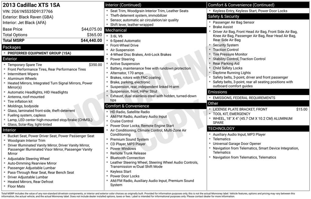 19" x 8.5" Aluminum w/Premium Paint Wheels, 4-Wheel Disc Brakes, 8 Speakers, ABS brakes, Adaptive suspension, Air Conditioning, Alloy wheels, AM/FM radio: SiriusXM, Auto tilt-away steering wheel, Auto-dimming Rear-View mirror, Auto-leveling suspension, Automatic temperature control, Bodyside moldings, Bose Premium 8-Speaker Audio System Feature, Brake assist, Bumpers: body-color, Compass, Delay-off headlights, Driver door bin, Driver vanity mirror, Dual front impact airbags, Dual front side impact airbags, Electronic Stability Control, Emergency communication system: OnStar Directions & Connections, Emergency Tool Kit, Four wheel independent suspension, Front anti-roll bar, Front Bucket Seats, Front Center Armrest w/Storage, Front dual zone A/C, Front License Plate Bracket, Front reading lights, Fully automatic headlights, Garage door transmitter, Genuine wood console insert, Genuine wood dashboard insert, Heated door mirrors, High intensity discharge headlights: Bi-xenon, Illuminated entry, Knee airbag, Leather Shift Knob, Leather steering wheel, Low tire pressure warning, Occupant sensing airbag, Outside temperature display, Overhead airbag, Panic alarm, Passenger door bin, Passenger vanity mirror, Power door mirrors, Power driver seat, Power passenger seat, Power steering, Power windows, Preferred Equipment Group 1SA, Radio data system, Radio: AM/FM CUE Infotainment System, Rear anti-roll bar, Rear reading lights, Rear seat center armrest, Rear side impact airbag, Rear window defroster, Remote CD player, Remote keyless entry, Security system, Single Slot CD/MP3 Player, SiriusXM Satellite Radio w/HD, Soleil Keisel Leather Seating Surfaces, Speed control, Speed-sensing steering, Split folding rear seat, Spoiler, Steering wheel mounted audio controls, Tachometer, Telescoping steering wheel, Tilt steering wheel, Traction control, Trip computer, Turn signal indicator mirrors, Variably intermittent wipers, Voltmeter.