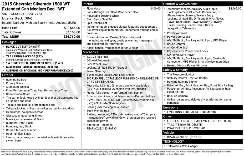 6-Speed Automatic Electronic with Overdrive, Dark Ash With Jet Black Interior Accents Cloth, 110-Volt AC Power Outlet, 150 Amp Alternator, 3.23 Rear Axle Ratio, 3.5" Diagonal Monochromatic Display, 4-Wheel Disc Brakes, 4" Round Black Tubular Assist Steps (LPO), 40/20/40 Front Split Bench Seat, 6 Speaker Audio System, 6 Speakers, ABS brakes, Air Conditioning, Black Power Adjustable Heated Outside Mirrors, Bluetooth® For Phone, Brake assist, Cloth Seat Trim, Color-Keyed Carpeting w/Rubberized Vinyl Floor Mats, Deep-Tinted Glass, Delay-off headlights, Driver door bin, Dual front impact airbags, Dual front side impact airbags, E85 FlexFuel Capable, Electronic Stability Control, Front & Rear Black Bowtie Emblems (LPO), Front anti-roll bar, Front Center Armrest w/Storage, Front Chrome Bumper, Front reading lights, Front wheel independent suspension, Fully automatic headlights, Graphite-Colored Rubberized-Vinyl Floor Covering, Heavy Duty Suspension, Heavy-Duty Rear Locking Differential, Low tire pressure warning, Manual Tilt Wheel Steering Column, Occupant sensing airbag, OnStar 6 Months Directions & Connections Plan, OnStar w/4G LTE, Overhead airbag, Overhead console, Passenger door bin, Passenger vanity mirror, Power steering, Power windows, Power Windows w/Driver Express Up, Radio data system, Rear Chrome Bumper, Rear reading lights, Rear step bumper, Rear Vision Camera w/Dynamic Guide Lines, Remote Keyless Entry, Single Slot CD/MP3 Player, SiriusXM Satellite Radio, Speed control, Speed-sensing steering, Tachometer, Tilt steering wheel, Traction control, Trailering Equipment, Trip computer, Variably intermittent wipers, Voltmeter, 6-Speed Automatic Electronic with Overdrive, Dark Ash With Jet Black Interior Accents Cloth.