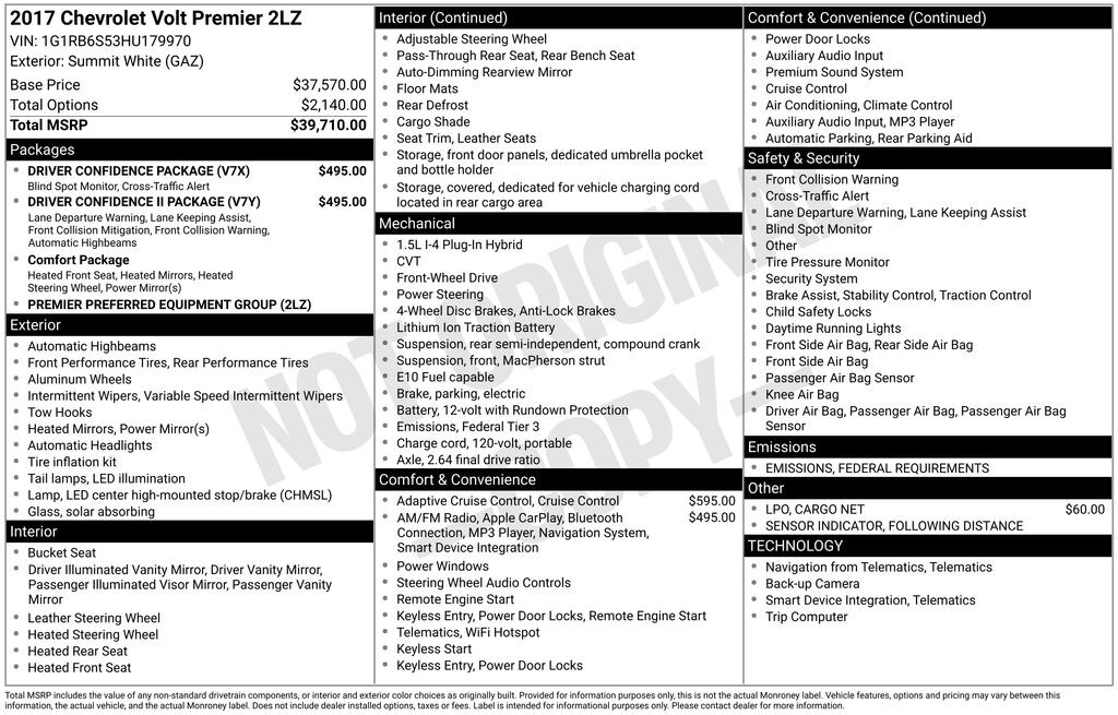 Summit White 2017 Chevrolet Volt Premier FWD 1-Speed Automatic 1.5L VVT DI DOHC 4-Cylinder Range Extender 1.5L VVT DI DOHC 4-Cylinder Range Extender, 4-Wheel Disc Brakes, 8 Speakers, ABS brakes, Adaptive Cruise Control, Air Conditioning, Alloy wheels, AM/FM radio: SiriusXM, Apple CarPlay, Auto-dimming Rear-View mirror, Automatic temperature control, Bose Premium 8-Speaker Audio System Feature, Brake assist, Bumpers: body-color, Cargo Net, Comfort Package, Compass, Delay-off headlights, Driver Confidence II Package, Driver Confidence Package, Driver door bin, Driver vanity mirror, Dual front impact airbags, Dual front side impact airbags, Electronic Stability Control, Emergency communication system: OnStar Guidance, Exterior Parking Camera Rear, Following Distance Sensor Indicator, Forward Automatic Braking, Forward Collision Alert, Front anti-roll bar, Front Bucket Seats, Front Center Armrest, Front reading lights, Front wheel independent suspension, Fully automatic headlights, Heated door mirrors, Heated Driver & Passenger Front Seats, Heated front seats, Heated rear seats, Heated Steering Wheel, Heated steering wheel, Illuminated entry, IntelliBeam Automatic High-Beam Headlamps, Knee airbag, Lane Keep Assist, Leather-Appointed Seat Trim, Low tire pressure warning, Low-Speed Forward Automatic Braking, NavTraffic, Occupant sensing airbag, Outside Heated Power-Adjustable Body-Color Mirrors, Outside temperature display, Overhead airbag, Overhead console, Panic alarm, Passenger door bin, Passenger vanity mirror, Power door mirrors, Power steering, Power windows, Preferred Equipment Group 2LZ, Premium audio system: Chevrolet MyLink, Radio: Chevrolet MyLink AM/FM Stereo, Radio: Chevrolet MyLink AM/FM Stereo w/Navigation, Rear Cross-Traffic Alert Sensor Indicator, Rear reading lights, Rear seat center armrest, Rear side impact airbag, Rear window defroster, Remote keyless entry, Security system, Side Blind Zone Alert w/Lane Change Alert, SiriusXM Satellite Radio, SiriusXM Travel Link, Speed control, Speed-sensing steering, Split folding rear seat, Steering wheel mounted audio controls, Telescoping steering wheel, Tilt steering wheel, Traction control, Trip computer, Variably intermittent wipers, Wheels: 17" x 7" Split 5-Spoke Aluminum, 1.5L VVT DI DOHC 4-Cylinder Range Extender.