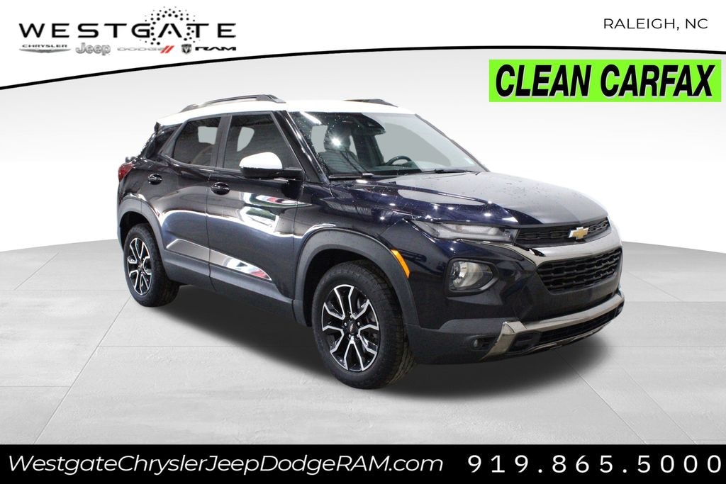 Midnight Blue Metallic 2021 Chevrolet TrailBlazer ACTIV FWD CVT 1.3L Ecotec Turbo DOHC SIDI w/VVT 1 Type-A & 1 Type-C USB Charging-Only Ports, 120-Volt Power Outlet, 2-Way Power Driver Lumbar Seat Adjuster, 4-Way Manual Front Passenger Seat Adjuster, 4-Wheel Disc Brakes, 5.45 Axle Ratio, 6 Speakers, 6-Speaker Audio System Feature, 8-Way Power Driver Seat Adjuster, 8" Diagonal Color Touchscreen Display, ABS brakes, Air Conditioning, All-Weather Floor Mats, Alloy wheels, AM/FM radio, Apple CarPlay/Android Auto, Auto High-beam Headlights, Brake assist, Bumpers: body-color, Cabin Humidity Sensor, Compass, Convenience Package, Delay-off headlights, Driver & Front Passenger Illuminated Vanity Mirrors, Driver Confidence Package, Driver door bin, Driver vanity mirror, Dual front impact airbags, Dual front side impact airbags, Electronic Stability Control, Emergency communication system: OnStar and Chevrolet connected services capable, Exterior Parking Camera Rear, Flat-Folding Front Passenger Seatback, Front anti-roll bar, Front Bucket Seats, Front Center Armrest, Front fog lights, Front reading lights, Front wheel independent suspension, Fully automatic headlights, Heated door mirrors, Heated Driver & Front Passenger Seats, Heated front seats, Illuminated entry, Inside Rear-View Auto-Dimming Mirror, Knee airbag, Lane Change Alert w/Side Blind Zone Alert, Leather Shift Knob, Leather steering wheel, Leatherette Seat Trim, Low tire pressure warning, Occupant sensing airbag, Overhead airbag, Overhead console, Panic alarm, Passenger door bin, Passenger vanity mirror, Power door mirrors, Power driver seat, Power steering, Power windows, Preferred Equipment Group 1SA, Radio data system, Radio: Chevrolet Infotainment 3 System, Rear Cross Traffic Alert, Rear Park Assist, Rear seat center armrest, Rear side impact airbag, Rear window defroster, Rear window wiper, Remote keyless entry, Ride & Handling Suspension, Roof rack: rails only, Security system, Single-Zone Auto Climate Control Air Conditioning, SiriusXM Radio, Speed control, Split folding rear seat, Spoiler, Steering wheel mounted audio controls, Summit White Two-Tone Roof, Tachometer, Telescoping steering wheel, Tilt steering wheel, Traction control, Trip computer, Variably intermittent wipers, Wheel Locks, Wheels: 17" High Gloss Black Machined Aluminum, Wireless Apple CarPlay/Android Auto.