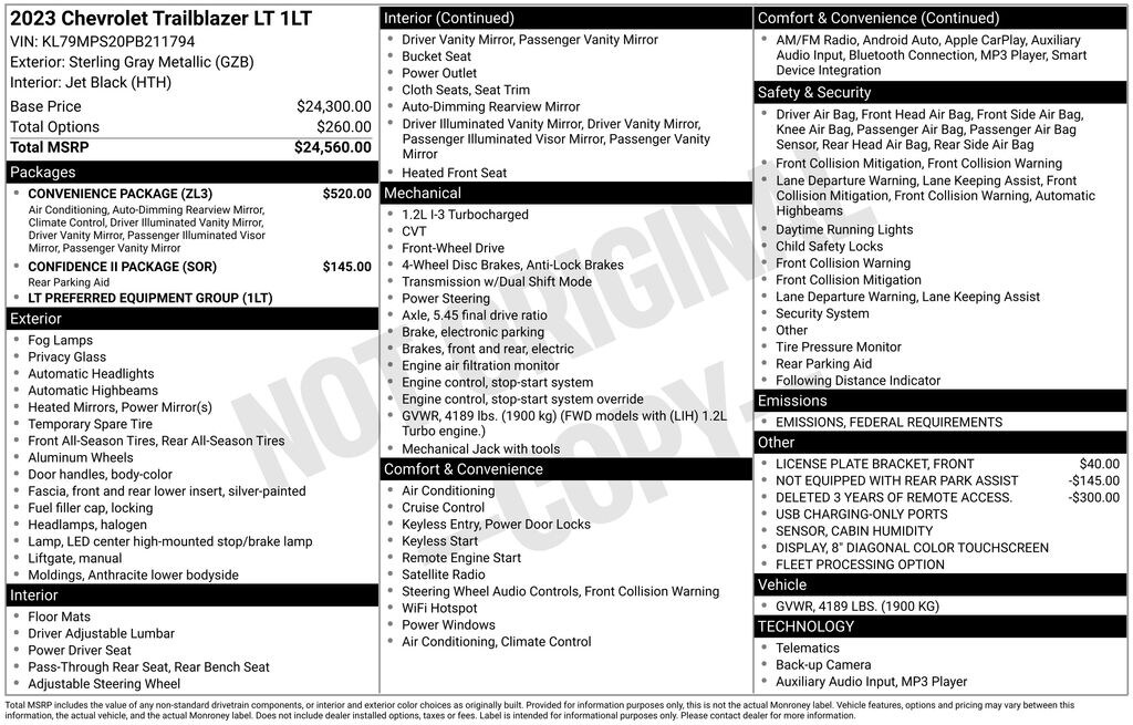 1 Type-A & 1 Type-C USB Charging-Only Ports, 120-Volt Power Outlet, 8" Diagonal Color Touchscreen Display, Cabin Humidity Sensor, Confidence II Package, Convenience Package, Driver & Front Passenger Illuminated Vanity Mirrors, Inside Rear-View Auto-Dimming Mirror, Preferred Equipment Group 1LT, Rear Park Assist, Single-Zone Auto Climate Control Air Conditioning, 2-Way Adjustable Front Head Restraints, 2-Way Power Driver Lumbar Seat Adjuster, 4-Way Manual Front Passenger Seat Adjuster, 4-Wheel Disc Brakes, 5.45 Axle Ratio, 6 Speakers, 6-Speaker Audio System Feature, 7" Diagonal Color Touchscreen, 8-Way Power Driver Seat Adjuster, ABS brakes, Air Conditioning, Alloy wheels, AM/FM radio: SiriusXM, Auto High-beam Headlights, Brake assist, Bumpers: body-color, Cloth Seat Trim, Compass, Delay-off headlights, Deleted 3 Years of Remote Access, Driver door bin, Driver vanity mirror, Dual front impact airbags, Dual front side impact airbags, Electronic Stability Control, Emergency communication system: OnStar and Chevrolet connected services capable, Exterior Parking Camera Rear, Flat-Folding Front Passenger Seatback, Front anti-roll bar, Front Bucket Seats, Front Center Armrest, Front fog lights, Front License Plate Bracket, Front reading lights, Front wheel independent suspension, Fully automatic headlights, Heated door mirrors, Heated Driver & Front Passenger Seats, Heated front seats, Illuminated entry, Knee airbag, Low tire pressure warning, Not Equipped w/Rear Park Assist (060), Occupant sensing airbag, Overhead airbag, Overhead console, Panic alarm, Passenger door bin, Passenger vanity mirror, Power door mirrors, Power driver seat, Power steering, Power windows, Radio data system, Radio: Chevrolet Infotainment 3 System, Rear side impact airbag, Rear window defroster, Rear window wiper, Remote keyless entry, Ride & Handling Suspension, Security system, SiriusXM Radio, Speed control, Split folding rear seat, Spoiler, Steering wheel mounted audio controls, Tachometer, Telescoping steering wheel, Tilt steering wheel, Traction control, Trip computer, Variably intermittent wipers, Wheels: 17" High Gloss Black Machined Aluminum, Wireless Apple CarPlay/Android Auto, 1 Type-A & 1 Type-C USB Charging-Only Ports, 120-Volt Power Outlet, 8" Diagonal Color Touchscreen Display, Cabin Humidity Sensor, Confidence II Package, Convenience Package, Driver & Front Passenger Illuminated Vanity Mirrors, Inside Rear-View Auto-Dimming Mirror, Preferred Equipment Group 1LT, Rear Park Assist, Single-Zone Auto Climate Control Air Conditioning.
