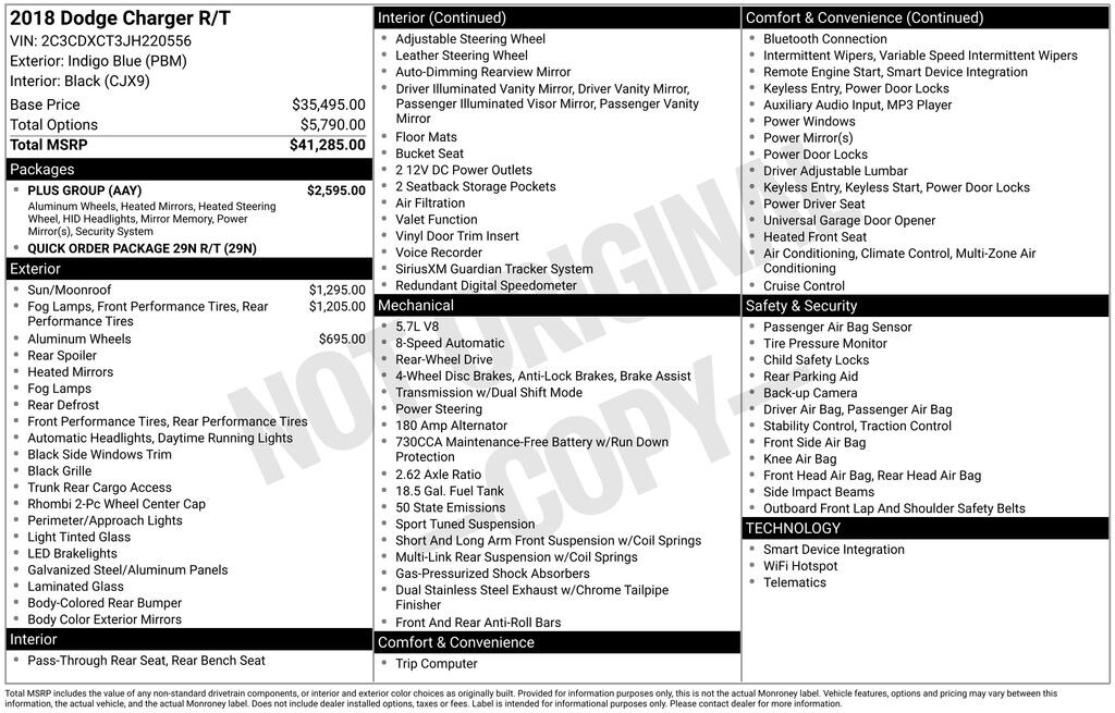 Black Artificial Leather, Auto-Dimming Exterior Driver Mirror, Bi-Function HID Projector Head Lamps, Black Grille, Body Color Fascias, Dodge Performance Pages, Driver & Passenger Lower LED Lamps, Front Overhead LED Lighting, Functional Hood Scoop, Heated Steering Wheel, Lower Bodyside Bodycolor Cladding, Performance Suspension, Plus Group, Power Heated Memory Mirrors w/Man F/Away, Projector LED Fog Lamps, Quick Order Package 29N R/T, R/T Badge, Rhombi 2-Pc Wheel Center Cap, Security Alarm, Super Track Pack Grille Badge, Super Track Pak, Trailer Sway Damping, Wheels: 20" x 8.0" Granite Crystal Aluminum, 4-Wheel Disc Brakes, 6 Speakers, ABS brakes, Air Conditioning, All Speed Traction Control, Alloy wheels, AM/FM radio: SiriusXM, Anti-whiplash front head restraints, Apple CarPlay/Android Auto, Auto-dimming Rear-View mirror, Automatic temperature control, Body Color Exterior Mirrors, Brake assist, Bumpers: body-color, Cloth Sport Seat, Compass, Delay-off headlights, Driver door bin, Driver vanity mirror, Dual front impact airbags, Dual front side impact airbags, Electronic Stability Control, Emergency communication system: SiriusXM Guardian, Exterior Mirrors w/Heating Element, Four wheel independent suspension, Front anti-roll bar, Front Bucket Seats, Front Center Armrest, Front dual zone A/C, Front fog lights, Front reading lights, Fully automatic headlights, Garage door transmitter: HomeLink, Heated door mirrors, Heated Front Seats, Heated front seats, Illuminated entry, Knee airbag, Leather Shift Knob, Low tire pressure warning, Occupant sensing airbag, Outside temperature display, Overhead airbag, Overhead console, Panic alarm, ParkView Rear Back-Up Camera, Passenger door bin, Passenger vanity mirror, Power 4-Way Driver Lumbar Adjust, Power 8-Way Driver Seat, Power door mirrors, Power driver seat, Power steering, Power Sunroof, Power windows, Radio data system, Radio: Uconnect 4C w/8.4" Display, Rear anti-roll bar, Rear Armrest w/Cupholder Seat, Rear reading lights, Rear seat center armrest, Rear window defroster, Remote keyless entry, Speed control, Speed-Sensitive Wipers, Split folding rear seat, Spoiler, Steering wheel mounted audio controls, Tachometer, Telescoping steering wheel, Tilt steering wheel, Traction control, Trip computer, Variably intermittent wipers, Wheels: 20" x 8.0" Premium Painted Aluminum, Black Artificial Leather, Auto-Dimming Exterior Driver Mirror, Bi-Function HID Projector Head Lamps, Black Grille, Body Color Fascias, Dodge Performance Pages, Driver & Passenger Lower LED Lamps, Front Overhead LED Lighting, Functional Hood Scoop, Heated Steering Wheel, Lower Bodyside Bodycolor Cladding, Performance Suspension, Plus Group, Power Heated Memory Mirrors w/Man F/Away, Projector LED Fog Lamps, Quick Order Package 29N R/T, R/T Badge, Rhombi 2-Pc Wheel Center Cap, Security Alarm, Super Track Pack Grille Badge, Super Track Pak, Trailer Sway Damping, Wheels: 20" x 8.0" Granite Crystal Aluminum.