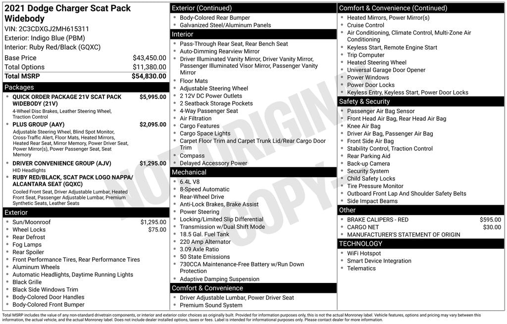 Ruby Red/Black Artificial Leather, 4-Wheel Disc Brakes, 6 Speakers, ABS brakes, Adaptive Damping Suspension, Air Conditioning, All Speed Traction Control, Alloy wheels, AM/FM radio: SiriusXM, Anti-whiplash front head restraints, Apple CarPlay/Android Auto, Auto Adjust In Reverse Exterior Mirrors, Auto-Dimming Exterior Driver Mirror, Auto-dimming Rear-View mirror, Automatic temperature control, Bi-Function HID Projector Head Lamps, Black-Edged Premium Floormats, Blind Spot & Cross Path Detection, Blind Spot Memory/Power/Heat Mirror, Body Color Fender Flares, Brake assist, Brake Calipers - Red, Brembo 6-Pot Fixed Front Caliper Brakes, Bumpers: body-color, Cargo Net, Cloth Performance Seats w/Bee Logo, Compass, Delay-off headlights, Driver & Passenger Lower LED Lamps, Driver Convenience Group, Driver door bin, Driver vanity mirror, Dual front impact airbags, Dual front side impact airbags, Electronic Stability Control, Emergency communication system: SiriusXM Guardian, Exterior Mirrors Courtesy Lamps, Flat-Bottom Steering Wheel, Four wheel independent suspension, Front anti-roll bar, Front Bucket Seats, Front Center Armrest, Front dual zone A/C, Front fog lights, Front Overhead LED Lighting, Front reading lights, Fully automatic headlights, Garage door transmitter: HomeLink, Heated 2nd Row Seats, Heated door mirrors, Heated front seats, Heated steering wheel, Illuminated entry, Illuminated Rear Cupholders, Knee airbag, Leather Shift Knob, Low tire pressure warning, Manufacturer's Statement of Origin, Occupant sensing airbag, Outside temperature display, Overhead airbag, Overhead console, Panic alarm, ParkView Rear Back-Up Camera, Passenger door bin, Passenger vanity mirror, Performance Shift Indicator, Plus Group, Power door mirrors, Power driver seat, Power Driver/Passenger 4-Way Lumbar Adjust, Power Front Driver/Passenger Seats, Power steering, Power Sunroof, Power Tilt/Telescope Steering Column, Power windows, Premium-Stitched Dash Panel, Quick Order Package 21V Scat Pack Widebody, Radio data system, Radio: Uconnect 4C w/8.4" Display, Radio/Driver Seat/Mirrors Memory, Rear anti-roll bar, Rear reading lights, Rear Seat Armrest w/Storage Cupholder, Rear seat center armrest, Rear window defroster, Remote keyless entry, Scat Pack Logo Nappa/Alcantara Seat, Security system, Speed control, Speed-Sensitive Wipers, Split folding rear seat, Spoiler, Sport steering wheel, Steering wheel mounted audio controls, Tachometer, Telescoping steering wheel, Tilt steering wheel, Traction control, Trip computer, Variably intermittent wipers, Ventilated Front Seats, Wheels: 20" x 11" Devil's Rim Aluminum, Wheels: 20" x 9" Lo Gloss Granite Crystal, Widebody Competition Suspension, Widebody Package, Ruby Red/Black Artificial Leather.
