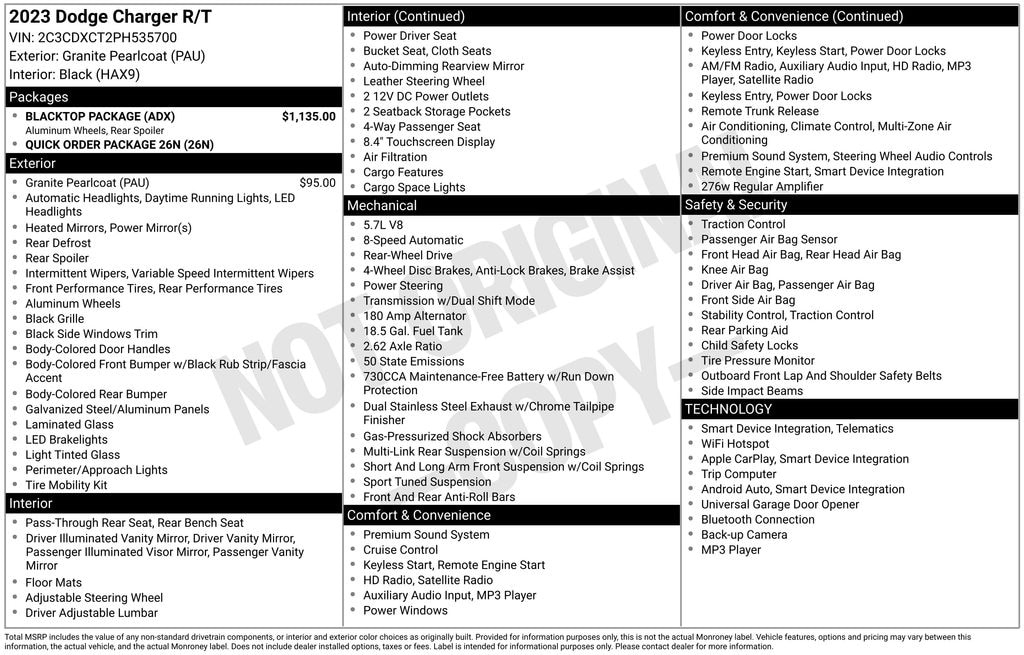 Black Cloth, 1-Yr SiriusXM Guardian Trial, 2-Piece Shark Fin Antenna, 4-Wheel Disc Brakes, 4G LTE Wi-Fi Hot Spot, 6 Speakers, 8.4" Touchscreen Display, ABS brakes, Air Conditioning, Alloy wheels, AM/FM radio: SiriusXM, Anti-whiplash front head restraints, Apple CarPlay, Apple CarPlay/Android Auto, Auto-dimming Rear-View mirror, Automatic temperature control, Black 1-Piece Performance Spoiler, Black Dodge Grille Badge, Blacktop Package, Blacktop R/T Badge, Brake assist, Bumpers: body-color, Cloth Performance Seats, Compass, Delay-off headlights, Driver door bin, Driver vanity mirror, Dual front impact airbags, Dual front side impact airbags, Electronic Stability Control, Emergency communication system: SiriusXM Guardian, For Details, Visit DriveUconnect.com, Four wheel independent suspension, Front anti-roll bar, Front Bucket Seats, Front Center Armrest, Front dual zone A/C, Front reading lights, Fully automatic headlights, Garage door transmitter: HomeLink, Gloss Black I/P Cluster Trim Rings, Google Android Auto, GPS Antenna Input, HD Radio, Heated door mirrors, Illuminated entry, Integrated Center Stack Radio, Integrated Voice Command w/Bluetooth, Knee airbag, Leather Shift Knob, Low tire pressure warning, Media Hub (2 USB, AUX), Occupant sensing airbag, Outside temperature display, Overhead airbag, Overhead console, Panic alarm, ParkView Rear Back-Up Camera, Passenger door bin, Passenger vanity mirror, Power 2-Way Driver Lumbar Adjust, Power 8-Way Driver Seat, Power door mirrors, Power driver seat, Power steering, Power windows, Quick Order Package 26N, Radio: Uconnect 4C w/8.4" Display, Rear anti-roll bar, Rear Armrest w/Cupholder Seat, Rear reading lights, Rear seat center armrest, Rear window defroster, Remote keyless entry, Rhombi 2-Pc Wheel Center Cap, Satin Black Charger Decklid Badge, Satin Black Dodge Tail Lamp Badge, Speed control, Speed-Sensitive Wipers, Split folding rear seat, Spoiler, Sport steering wheel, Steering wheel mounted audio controls, Tachometer, Telescoping steering wheel, Tilt steering wheel, Traction control, Trip computer, USB Host Flip, Variably intermittent wipers, Wheels: 20" x 8" Black Noise Painted, Wheels: 20" x 8" Machined w/Granite Pocket, Black Cloth.
