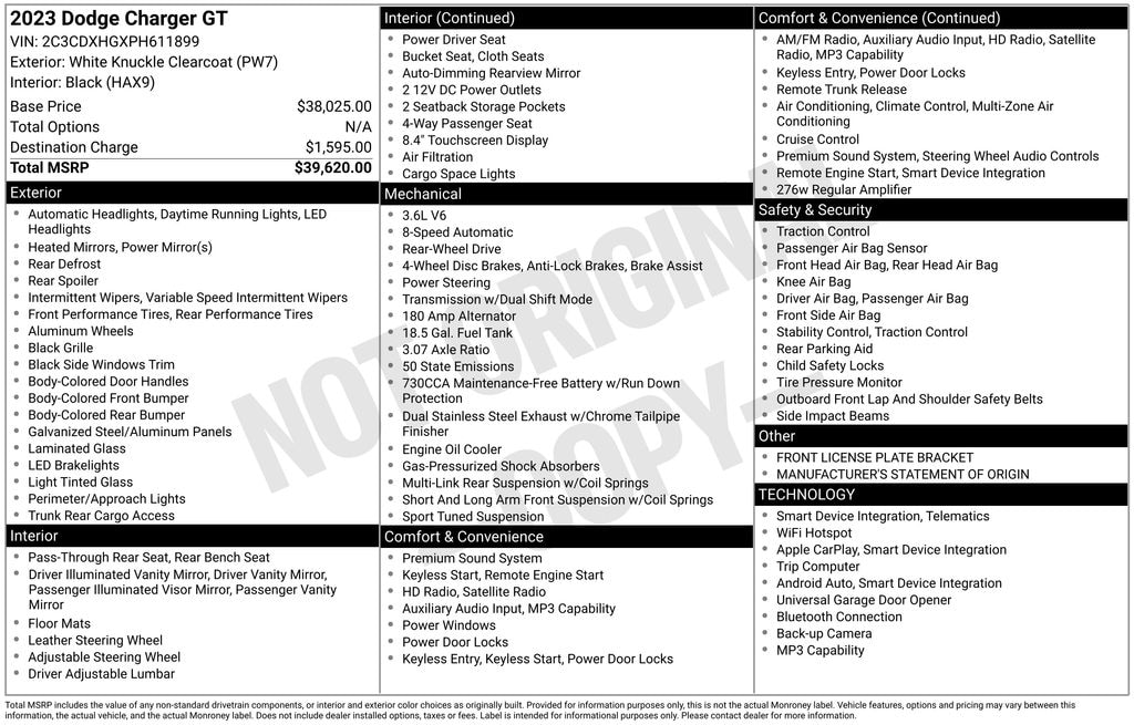 This striking 2023 Dodge Charger GT delivers a thrilling blend of power and sophistication. Equipped with a potent 3.6L V6 engine and an 8-speed automatic transmission, this Charger GT offers an exhilarating driving experience with impressive fuel efficiency. The sleek, aerodynamic exterior in a bold White finish turns heads wherever it goes, while the well-appointed interior pampers you with premium features like dual-zone climate control, power-adjustable seating, and a state-of-the-art Uconnect infotainment system with an 8.4-inch touchscreen display.
