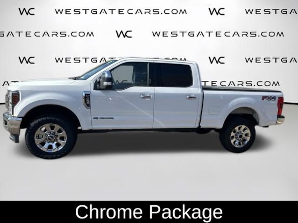 The exterior of this F-250SD is dressed to impress, with a chrome package that includes 18-inch chrome wheels, chrome mirror caps, and angular chrome step bars. The white paint finish is complemented by the chrome accents, creating a bold and sophisticated appearance.