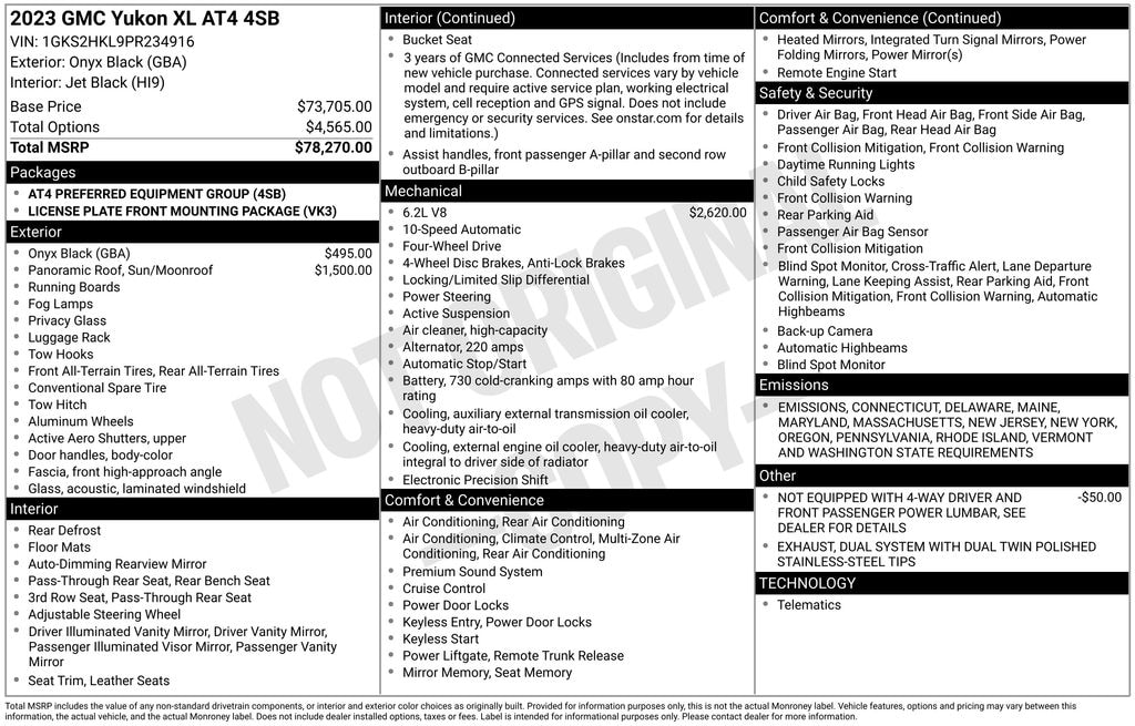 4WD, 2 Presets For Outside Rearview Mirrors, 3 Years of GMC Connected Services, 3 Years of OnStar Safety & Security, 3rd Row 60/40 Power-Folding Split-Bench Seat, Black Roof-Mounted Luggage Rack Side Rails, Bose 9-Speaker Stereo Audio System Feature, Bright Front & Rear Door Sill Plates, Dual-Pane Panoramic Power Sunroof, Front High-Approach Angle Fascia, Hands-Free Power Programmable Rear Liftgate, Heated & Ventilated Driver & Front Passenger Seats, Heated 2nd Row Outboard Position Seats, Heated Driver & Front Passenger Seats, Heated Steering Wheel, Heavy-Duty Air Filter, Hill Descent Control, Inside Rear-View Auto-Dimming Mirror, License Plate Front Mounting Package, Outside Heated Power-Adjustable Mirrors, Power Release 2nd Row 60/40 Split-Folding Bench Seat, Power Tilt & Telescopic Steering Column, Preferred Equipment Group 4SB, Red Horizontal-Mounted Recovery Hooks, Safety Alert Seat, Universal Home Remote, Wireless Charging, 3 Years of OnStar Safety & Security (DISC), 3.23 Rear Axle Ratio, 3rd row seats: split-bench, 4-Wheel Disc Brakes, 9 Speakers, ABS brakes, Adaptive suspension, Air Conditioning, Alloy wheels, AM/FM radio: SiriusXM with 360L, AM/FM Stereo, Apple CarPlay/Android Auto, Auto High-beam Headlights, Auto-dimming door mirrors, Auto-dimming Rear-View mirror, Auto-leveling suspension, Automatic Emergency Braking, Automatic temperature control, Brake assist, Bumpers: body-color, Compass, Delay-off headlights, Driver door bin, Driver vanity mirror, Dual Exhaust System, Dual front impact airbags, Dual front side impact airbags, Electronic Stability Control, Emergency communication system: OnStar and GMC connected services capable, Following Distance Indicator, Forward Collision Alert, Four wheel independent suspension, Front & Rear Park Assist, Front anti-roll bar, Front Bucket Seats, Front Center Armrest, Front dual zone A/C, Front fog lights, Front Pedestrian Braking, Front reading lights, Fully automatic headlights, Garage door transmitter, Heated door mirrors, Heated front seats, Heated rear seats, Heated steering wheel, Illuminated entry, IntelliBeam Automatic High Beam On/Off, Lane Change Alert w/Side Blind Zone Alert, Lane Keep Assist w/Lane Departure Warning, Low tire pressure warning, Magnetic Ride Control Suspension, Memory seat, Navigation System, Not Equipped w/4-Way Driver & Fr Pass Pwr Lumbar, Occupant sensing airbag, Outside temperature display, Overhead airbag, Overhead console, Panic alarm, Passenger door bin, Passenger vanity mirror, Perforated Leather Seating Surfaces, Power door mirrors, Power driver seat, Power Liftgate, Power passenger seat, Power steering, Power windows, Rain sensing wipers, Rear air conditioning, Rear anti-roll bar, Rear Cross Traffic Alert, Rear reading lights, Rear seat center armrest, Rear window defroster, Rear window wiper, Remote keyless entry, Roof rack: rails only, Security system, SiriusXM w/360L, Speed control, Speed-sensing steering, Split folding rear seat, Spoiler, Steering wheel memory, Steering wheel mounted audio controls, Tachometer, Telescoping steering wheel, Tilt steering wheel, Traction control, Trip computer, Turn signal indicator mirrors, Variably intermittent wipers, Ventilated front seats, Voltmeter, Wheels: 20" x 9" 6-Spoke Machined Aluminum, 4WD, 2 Presets For Outside Rearview Mirrors, 3 Years of GMC Connected Services, 3 Years of OnStar Safety & Security, 3rd Row 60/40 Power-Folding Split-Bench Seat, Black Roof-Mounted Luggage Rack Side Rails, Bose 9-Speaker Stereo Audio System Feature, Bright Front & Rear Door Sill Plates, Dual-Pane Panoramic Power Sunroof, Front High-Approach Angle Fascia, Hands-Free Power Pr