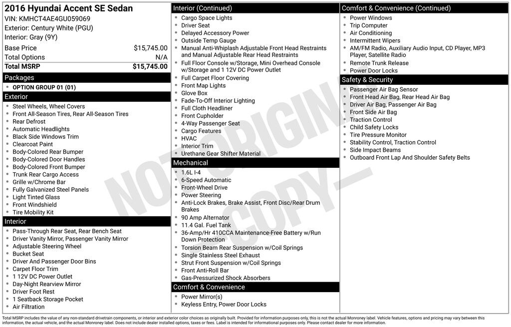 Finished in Century White, this 2016 Accent SE presents a clean and modern design with body-colored bumpers and door handles, chrome grille bar, and steel wheels with full wheel covers. Equipped with automatic headlights, light-tinted glass, and rear defrost, it delivers both style and practicality.