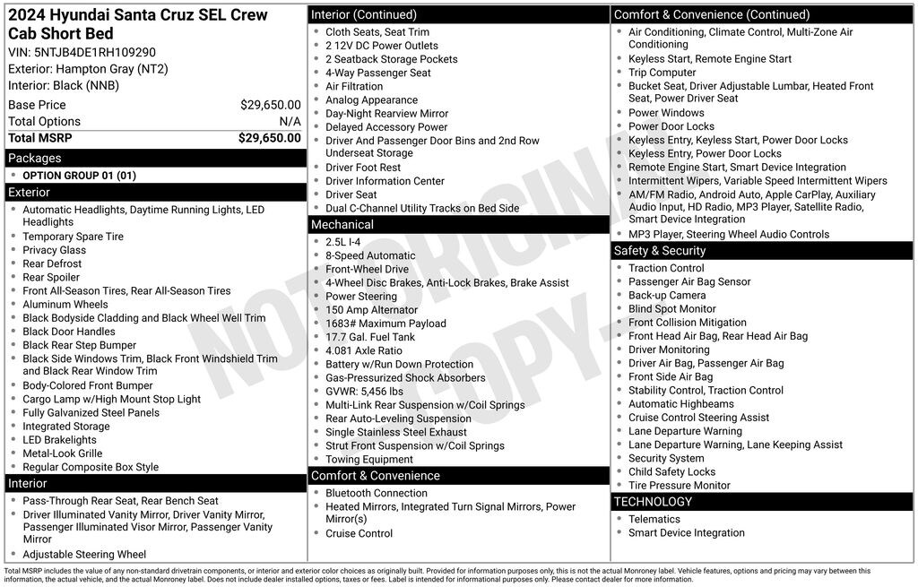 Apple CarPlay & Android Auto, Automatic temperature control, Exterior Parking Camera Rear, Front dual zone A/C, Heated door mirrors, Heated front seats, Option Group 01, Power door mirrors, 18" x 7.5J Alloy Wheels, 4-Wheel Disc Brakes, 4.081 Axle Ratio, 6 Speakers, ABS brakes, Air Conditioning, Alloy wheels, AM/FM radio: SiriusXM, Auto High-beam Headlights, Auto-leveling suspension, Brake assist, Bumpers: body-color, Delay-off headlights, Driver door bin, Driver vanity mirror, Dual C-Channel Utility Tracks on Bed Side, Dual front impact airbags, Dual front side impact airbags, Electronic Stability Control, Emergency communication system: Bluelink+, Four wheel independent suspension, Front anti-roll bar, Front Bucket Seats, Front Center Armrest, Front reading lights, Fully automatic headlights, Heated Front Bucket Seats, Illuminated entry, Low tire pressure warning, Occupant sensing airbag, Outside temperature display, Overhead airbag, Overhead console, Panic alarm, Passenger door bin, Passenger vanity mirror, Power driver seat, Power steering, Power windows, Radio data system, Radio: AM/FM/HD Audio System, Rear anti-roll bar, Rear side impact airbag, Rear step bumper, Rear window defroster, Remote keyless entry, Security system, Speed control, Speed-sensing steering, Split folding rear seat, Spoiler, Stain & Odor Resistant Cloth Seat Trim, Steering wheel mounted audio controls, Tachometer, Telescoping steering wheel, Tilt steering wheel, Traction control, Trip computer, Turn signal indicator mirrors, Variably intermittent wipers, Apple CarPlay & Android Auto, Automatic temperature control, Exterior Parking Camera Rear, Front dual zone A/C, Heated door mirrors, Heated front seats, Option Group 01, Power door mirrors.