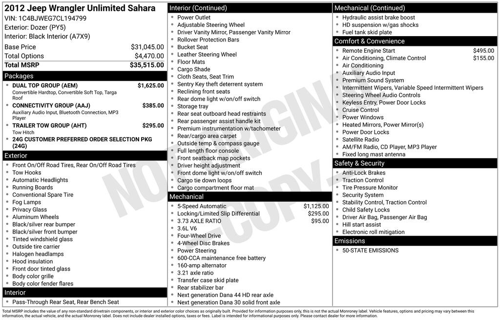Black 3-Piece Hard Top, Class II Receiver Hitch, Connectivity Group, Dual Top Group, Freedom Panel Storage Bag, Quick Order Package 24G, Rear Window Defroster, Rear Window Wiper/Washer, Sunrider Soft Top, Trailer Sway Damping, Trailer Tow Group, Trailer Tow w/4-Pin Connector Wiring, Vehicle Information Center, 18" x 7.5" Painted Aluminum Wheels, 4-Wheel Disc Brakes, 7 Speakers, ABS brakes, Air Conditioning, Air Conditioning w/Auto Temperature Control, Air Filtering, Alloy wheels, AM/FM radio: SIRIUS, Anti-Spin Differential Rear Axle, Audio Jack Input for Mobile Devices, Brake assist, CD player, Cloth Bucket Seats, Compass, Driver door bin, Driver vanity mirror, Dual front impact airbags, Electronic Stability Control, Front anti-roll bar, Front Bucket Seats, Front Center Armrest w/Storage, Front fog lights, Fully automatic headlights, Heated door mirrors, Heavy Duty Suspension w/Gas Shocks, Illuminated entry, Integrated roll-over protection, Leather steering wheel, Low tire pressure warning, Occupant sensing airbag, Outside temperature display, Panic alarm, Passenger door bin, Passenger vanity mirror, Power door mirrors, Power steering, Power windows, Radio data system, Radio: Uconnect 130 CD/MP3, Rear anti-roll bar, Remote keyless entry, Remote Start System, Security system, Speed control, Split folding rear seat, Steering wheel mounted audio controls, Tachometer, Tilt steering wheel, Traction control, Trip computer, Variably intermittent wipers, Black 3-Piece Hard Top, Class II Receiver Hitch, Connectivity Group, Dual Top Group, Freedom Panel Storage Bag, Quick Order Package 24G, Rear Window Defroster, Rear Window Wiper/Washer, Sunrider Soft Top, Trailer Sway Damping, Trailer Tow Group, Trailer Tow w/4-Pin Connector Wiring, Vehicle Information Center.