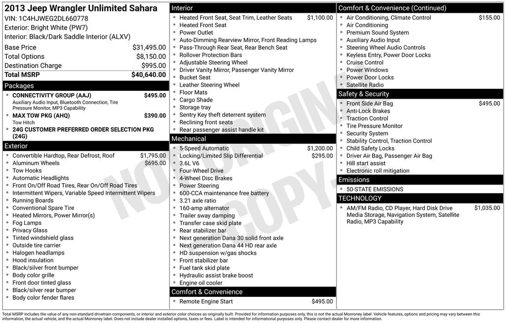 1-Year SIRIUSXM Travel Link Service, 18" x 7.5" 7-Spoke Polished Aluminum Wheels, 18" x 7.5" Polished Satin Carbon Wheels, 4-Wheel Disc Brakes, 40GB Hard Drive w/28GB Available, 6.5" Touch Screen Display, 7 Speakers, ABS brakes, Air Conditioning, Air Conditioning w/Auto Temperature Control, Air Filtering, Alloy wheels, AM/FM radio: SIRIUS, Anti-Spin Differential Rear Axle, Audio Jack Input for Mobile Devices, Auto-dimming Rear-View mirror, Brake assist, CD player, Class II Receiver Hitch, Cloth Bucket Seats, Compass, Connectivity Group, Driver door bin, Driver vanity mirror, Dual front impact airbags, Electronic Stability Control, Freedom Panel Storage Bag, Front anti-roll bar, Front Bucket Seats, Front Center Armrest w/Storage, Front fog lights, Front reading lights, Fully automatic headlights, GPS Navigation, Heated door mirrors, Heated Front Seats, Heavy Duty Suspension w/Gas Shocks, Illuminated entry, Integrated roll-over protection, Leather steering wheel, Low tire pressure warning, Max Tow Package, Occupant sensing airbag, Outside temperature display, Panic alarm, Passenger door bin, Passenger vanity mirror, Power door mirrors, Power steering, Power windows, Quick Order Package 24G, Radio data system, Radio: Uconnect 130 AM/FM/CD/MP3, Radio: Uconnect 430N CD/DVD/MP3/HDD/NAV, Rear anti-roll bar, Rear Window Defroster, Rear Window Wiper/Washer, Remote keyless entry, Remote Start System, Remote USB Port, Security system, SiriusXM Travel Link, Speed control, Split folding rear seat, Steering wheel mounted audio controls, Supplemental Front Seat Side Airbags, Tachometer, Tilt steering wheel, Tire Pressure Monitoring Display, Traction control, Trailer Tow w/4-Pin Connector Wiring, Trip computer, Variably intermittent wipers, Vehicle Information Center.
