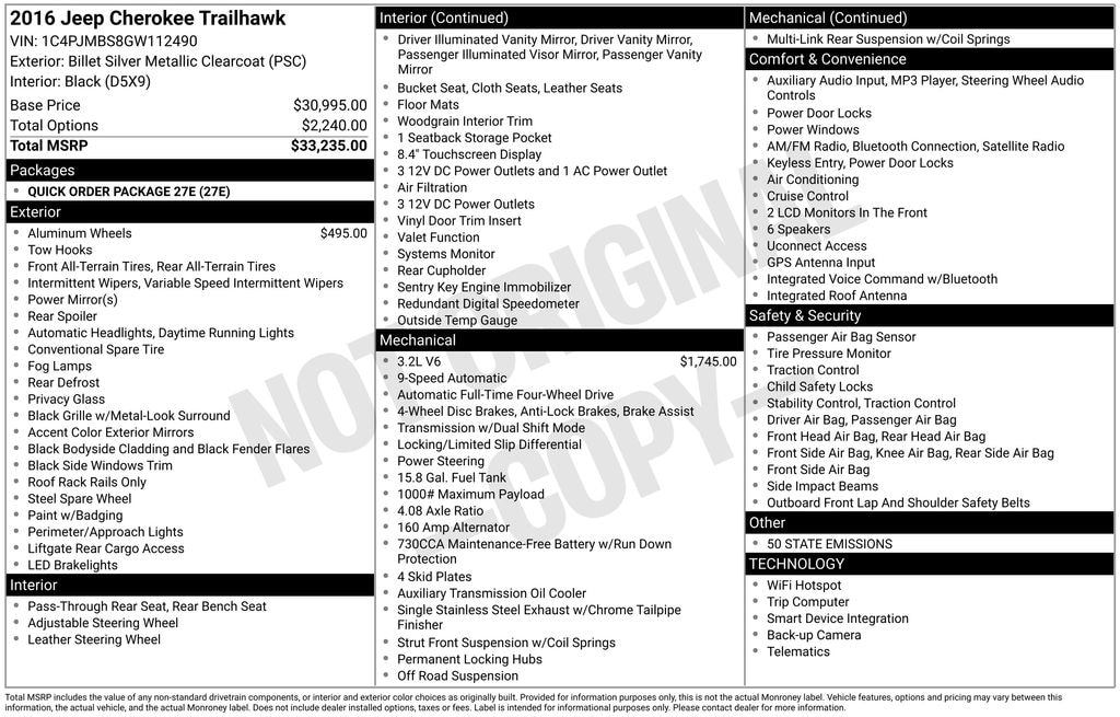 17" x 7.5" Aluminum Wheels, 4-Wheel Disc Brakes, 6 Speakers, 8.4" Touchscreen Display, ABS brakes, Accent Color Exterior Mirrors, Air Conditioning, Alloy wheels, AM/FM radio: SiriusXM, Anti-whiplash front head restraints, Auxiliary Transmission Oil Cooler, Brake assist, Cloth/Leather/Vinyl Bucket Seats, Compass, Delay-off headlights, Driver door bin, Driver vanity mirror, Dual front impact airbags, Dual front side impact airbags, Electronic Stability Control, Emergency communication system, Engine Oil Cooler, Four wheel independent suspension, Front anti-roll bar, Front Bucket Seats, Front Center Armrest, Front fog lights, Front reading lights, Fully automatic headlights, GPS Antenna Input, Illuminated entry, Integrated Voice Command w/Bluetooth, Knee airbag, Leather Shift Knob, Low tire pressure warning, Occupant sensing airbag, Off Road Suspension, Outside temperature display, Overhead airbag, Overhead console, Panic alarm, ParkView Rear Back-Up Camera, Passenger door bin, Passenger vanity mirror, Power door mirrors, Power steering, Power windows, Quick Order Package 27E, Radio data system, Radio: Uconnect 8.4, Rear anti-roll bar, Rear reading lights, Rear seat center armrest, Rear side impact airbag, Rear window defroster, Rear window wiper, Remote keyless entry, Roof rack: rails only, Speed control, Speed-sensing steering, Split folding rear seat, Spoiler, Steering wheel mounted audio controls, Tachometer, Telescoping steering wheel, Tilt steering wheel, Traction control, Trip computer, Uconnect Access, Variably intermittent wipers, Voltmeter, Wheels: 17" x 7.5" Black Painted Aluminum.