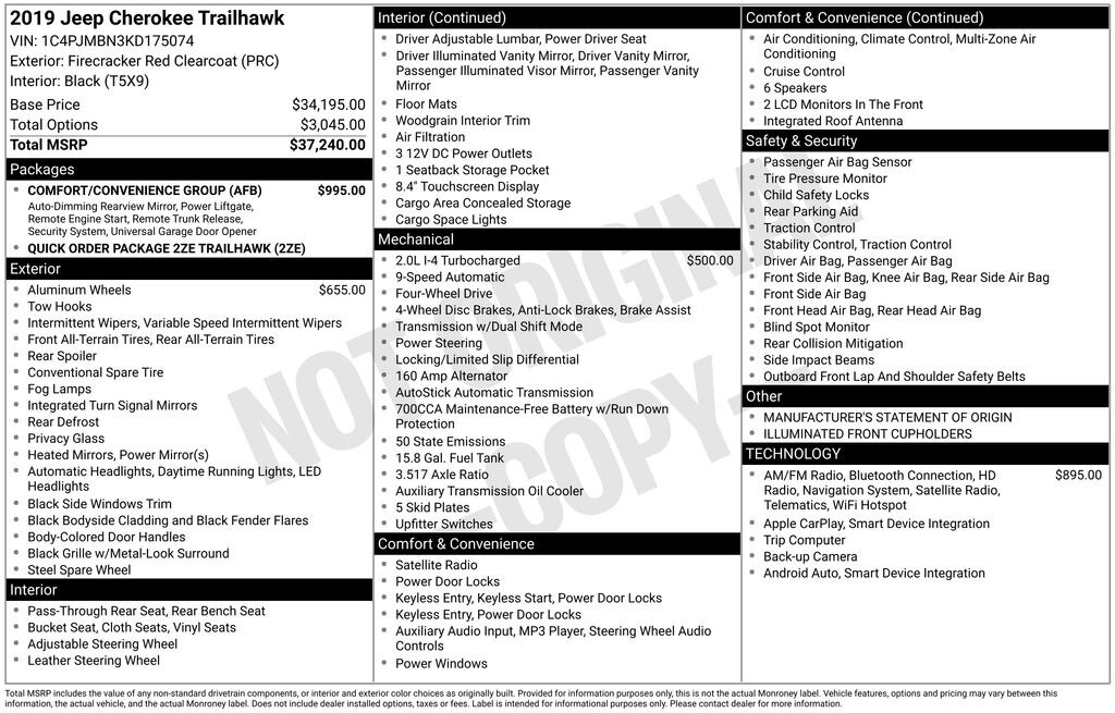 Firecracker Red Clearcoat 2019 Jeep Cherokee Trailhawk 4WD 9-Speed 948TE Automatic 2.0L I4 DOHC 1-Year SiriusXM Guardian Trial, 4-Wheel Disc Brakes, 4G LTE Wi-Fi Hot Spot, 5-Year SiriusXM Traffic Service, 5-Year SiriusXM Travel Link Service, 6 Speakers, 8.4" Touchscreen Display, ABS brakes, Air Conditioning, Alloy wheels, AM/FM radio: SiriusXM, Anti-whiplash front head restraints, Apple CarPlay, Apple CarPlay/Android Auto, Auto-Dimming Rear-View Mirror, Automatic temperature control, AutoStick Automatic Transmission, Auxiliary Transmission Oil Cooler, Brake assist, Cloth/Premium Vinyl Bucket Seats, Comfort/Convenience Group, Compass, Delay-off headlights, Driver door bin, Driver vanity mirror, Dual Bright Exhaust Tips, Dual front impact airbags, Dual front side impact airbags, Electronic Stability Control, Engine Oil Cooler, Exterior Mirrors Courtesy Lamps, Exterior Mirrors w/Supplemental Signals, For Details Visit DriveUconnect.com, Four wheel independent suspension, Front anti-roll bar, Front Bucket Seats, Front Center Armrest, Front dual zone A/C, Front fog lights, Front reading lights, Fully automatic headlights, Google Android Auto, GPS Antenna Input, GPS Navigation, HD Radio, Heated door mirrors, Hill Descent Control, Illuminated entry, Illuminated Front Cupholders (DISC), Integrated Voice Command w/Bluetooth, Knee airbag, Leather Shift Knob, Low tire pressure warning, Manufacturer's Statement of Origin (DISC), Occupant sensing airbag, Off Road Suspension, Outside temperature display, Overhead airbag, Overhead console, Panic alarm, ParkView Rear Back-Up Camera, Passenger door bin, Passenger vanity mirror, Power door mirrors, Power driver seat, Power Liftgate, Power steering, Power windows, Quick Order Package 2ZE Trailhawk, Radio data system, Radio: Uconnect 4 w/8.4" Display, Radio: Uconnect 4C Nav w/8.4" Display, Rear anti-roll bar, Rear reading lights, Rear seat center armrest, Rear side impact airbag, Rear window defroster, Rear window wiper, Remote keyless entry, Remote Start System, Roof rack: rails only, Security Alarm, SiriusXM Satellite Radio, SiriusXM Traffic Plus, SiriusXM Travel Link, Speed control, Speed-sensing steering, Split folding rear seat, Spoiler, Steering wheel mounted audio controls, Stop-Start Multiple VSM System, Tachometer, Telescoping steering wheel, Tilt steering wheel, Traction control, Trip computer, Turn signal indicator mirrors, Universal Garage Door Opener, USB Host Flip, Variably intermittent wipers, Voltmeter, Wheels: 17" x 7.5" Black Painted Aluminum, Wheels: 17" x 7.5" Painted/Polished Aluminum.