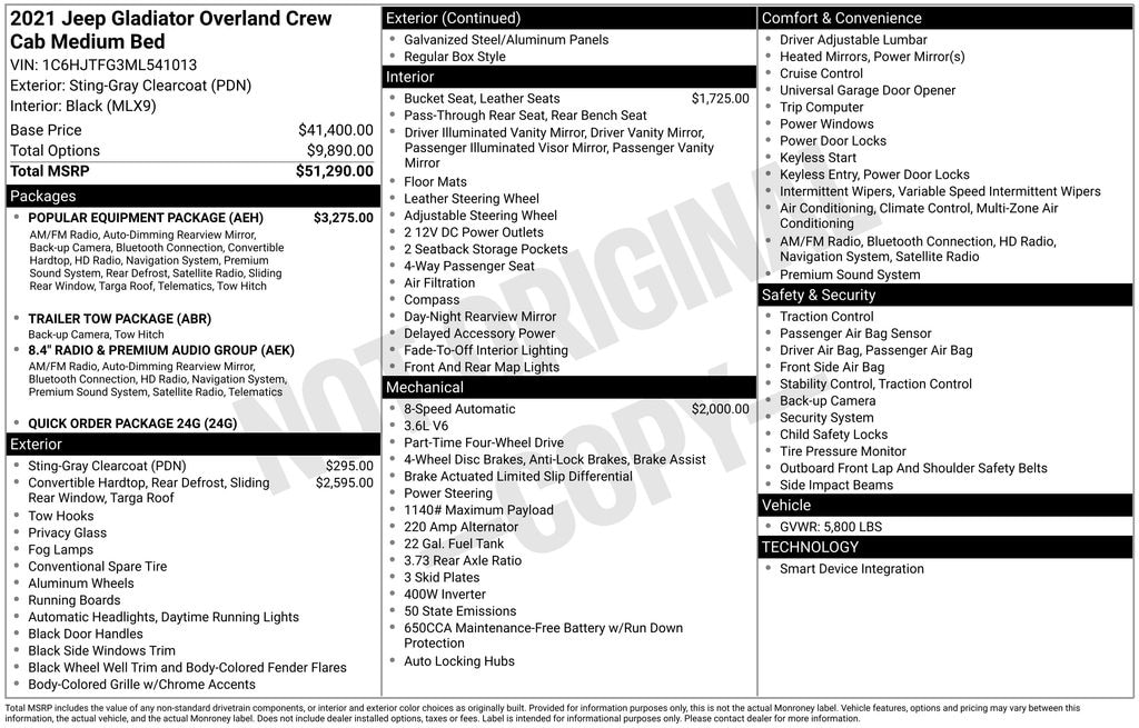 1-Year SiriusXM Guardian Trial, 240 Amp Alternator, 5-Year SiriusXM Traffic Service, 5-Year SiriusXM Travel Link Service, 8.4" Radio & Premium Audio Group, 8.4" Touchscreen Display, Alpine Premium Audio System, Auto-Dimming Rear-View Mirror, Black 3-Piece Hard Top, Class IV Hitch Receiver, Emergency/Assistance Call, For Details, Visit DriveUconnect.com, Freedom Panel Storage Bag, Full Length Floor Console Premium Armrest, GPS Navigation, HD Radio, Heavy-Duty Engine Cooling, Leather Trimmed Bucket Seats, Leather Wrapped Park Brake Handle, Leather Wrapped Shift Knob, Off-Road Info Pages, Popular Equipment Package, Premium Door Trim Panel, Premium Wrapped I/P Bezel, Quick Order Package 24G, Radio: Uconnect 4C Nav w/8.4" Display, Rear Armrest w/Cupholder Seat, Rear Sliding Window, Rear Window Defroster, SiriusXM Traffic Plus, SiriusXM Travel Link, Trailer Hitch Zoom, Trailer Tow Package, 110 mph Vehicle Max Speed Calibration, 3.73 Rear Axle Ratio, 4-Wheel Disc Brakes, 400W Inverter, 8 Speakers, ABS brakes, Air Conditioning, Alloy wheels, AM/FM radio: SiriusXM, Apple CarPlay/Android Auto, Automatic temperature control, Body Color 3-Piece Hard Top, Brake assist, Compass, Delay-off headlights, Driver door bin, Driver vanity mirror, Dual front impact airbags, Dual front side impact airbags, Electronic Stability Control, Front anti-roll bar, Front Bucket Seats, Front Center Armrest w/Storage, Front dual zone A/C, Front fog lights, Front reading lights, Fully automatic headlights, Garage door transmitter, Heated door mirrors, Illuminated entry, Integrated roll-over protection, Leather steering wheel, Low tire pressure warning, No Soft Top, Normal Duty Plus Suspension, Occupant sensing airbag, Outside temperature display, Overland Cloth Bucket Seats, Panic alarm, ParkView Rear Back-Up Camera, Passenger door bin, Passenger vanity mirror, Power door mirrors, Power steering, Power windows, Radio data system, Radio: Uconnect 4 w/7" Display, Rear anti-roll bar, Rear reading lights, Remote keyless entry, Security system, Speed control, Split folding rear seat, Steering wheel mounted audio controls, Tachometer, Telescoping steering wheel, Tilt steering wheel, Traction control, Trip computer, Variably intermittent wipers, Voltmeter, Wheels: 18" x 7.5" Granite Crystal Aluminum, 1-Year SiriusXM Guardian Trial, 240 Amp Alternator, 5-Year SiriusXM Traffic Service, 5-Year SiriusXM Travel Link Service, 8.4" Radio & Premium Audio Group, 8.4" Touchscreen Display, Alpine Premium Audio System, Auto-Dimming Rear-View Mirror, Black 3-Piece Hard Top, Class IV Hitch Receiver, Emergency/Assistance Call, For Details, Visit DriveUconnect.com, Freedom Panel Storage Bag, Full Length Floor Console Premium Armrest, GPS Navigation, HD Radio, Heavy-Duty Engine Cooling, Leather Trimmed Bucket Seats, Leather Wrapped Park Brake Handle, Leather Wrapped Shift Knob, Off-Road Info Pages, Popular Equipment Package, Premium Door Trim Panel, Premium Wrapped I/P Bezel, Quick Order Package 24G, Radio: Uconnect 4C Nav w/8.4" Display, Rear Armrest w/Cupholder Seat, Rear Sliding Window, Rear Window Defroster, SiriusXM Traffic Plus, SiriusXM Travel Link, Trailer Hitch Zoom, Trailer Tow Package.