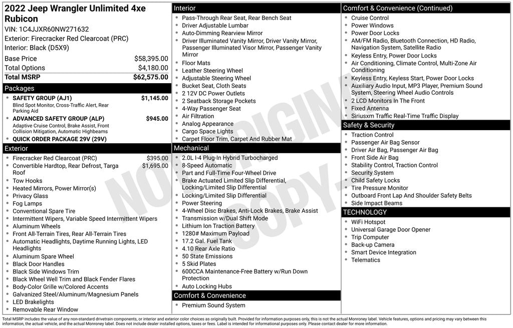 2.0L I4 DOHC, Adaptive Cruise Control w/Stop, Advanced Brake Assist, Advanced Safety Group, Auto High Beam Headlamp Control, Blind Spot & Cross Path Detection, Full Speed Forward Collision Warning Plus, Navigation System, ParkSense Rear Park Assist System, Quick Order Package 29V, Safety Group, 4-Wheel Disc Brakes, 4.10 Rear Axle Ratio, 9 Speakers, ABS brakes, Air Conditioning, Alloy wheels, AM/FM radio: SiriusXM, Apple CarPlay/Android Auto, Auto-dimming Rear-View mirror, Automatic temperature control, Black 3-Piece Hard Top, Brake assist, Compass, Delay-off headlights, Driver door bin, Driver vanity mirror, Dual front impact airbags, Dual front side impact airbags, Electronic Stability Control, Emergency communication system: SiriusXM Guardian, Freedom Panel Storage Bag, Front anti-roll bar, Front Bucket Seats, Front Center Armrest w/Storage, Front dual zone A/C, Front fog lights, Front reading lights, Fully automatic headlights, Garage door transmitter, Heated door mirrors, Illuminated entry, Integrated roll-over protection, Leather steering wheel, Low tire pressure warning, No Soft Top, Occupant sensing airbag, Outside temperature display, Panic alarm, ParkView Rear Back-Up Camera, Passenger door bin, Passenger vanity mirror, Performance Suspension, Power door mirrors, Power steering, Power windows, Premium Cloth Low-Back Bucket Seats, Radio data system, Radio: Uconnect 4C Nav w/8.4" Display, Rear anti-roll bar, Rear reading lights, Rear Window Defroster, Rear Window Wiper/Washer, Remote keyless entry, Security system, Speed control, Split folding rear seat, Steering wheel mounted audio controls, Tachometer, Telescoping steering wheel, Tilt steering wheel, Traction control, Trip computer, Variably intermittent wipers, Voltmeter, Wheels: 17" x 7.5" Machined/Painted Black, 2.0L I4 DOHC, Adaptive Cruise Control w/Stop, Advanced Brake Assist, Advanced Safety Group, Auto High Beam Headlamp Control, Blind Spot & Cross Path Detection, Full Speed Forward Collision Warning Plus, Navigation System, ParkSense Rear Park Assist System, Quick Order Package 29V, Safety Group.