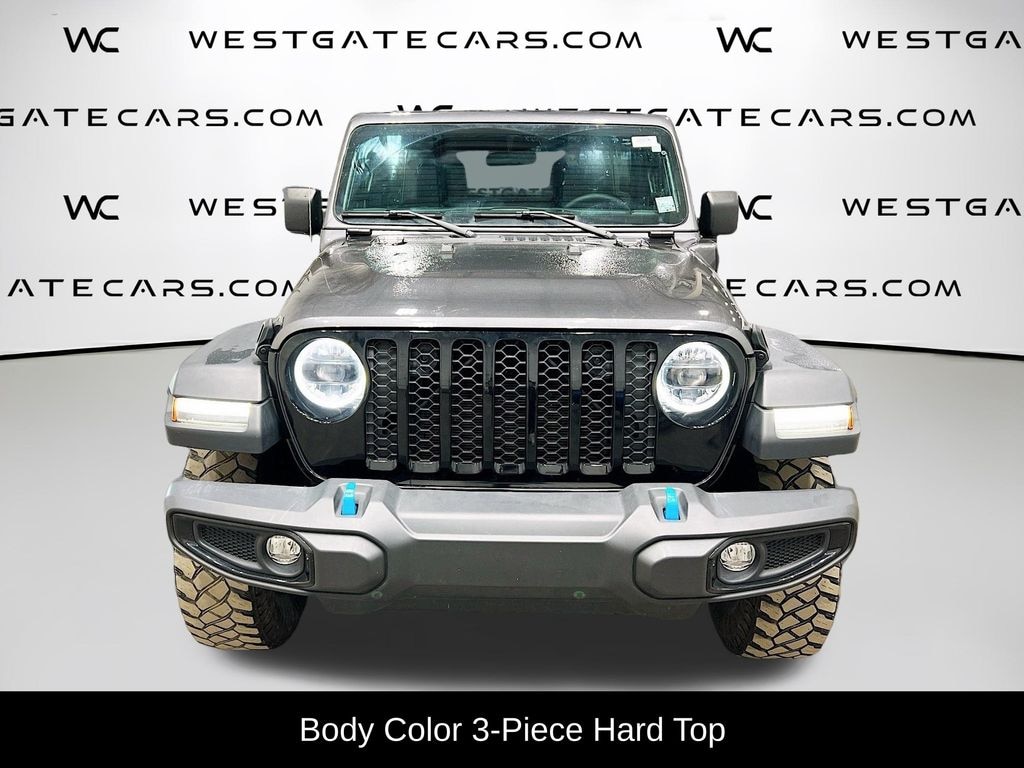 Outfitted with a wealth of premium features, the Wrangler Willys 4xe stands out with its distinctive Willys styling cues, including a black grille, body-color fender flares, and exclusive Willys 4xe hood decal. The rugged Gray exterior is complemented by a Black 3-piece hard top, providing both open-air freedom and all-weather protection.