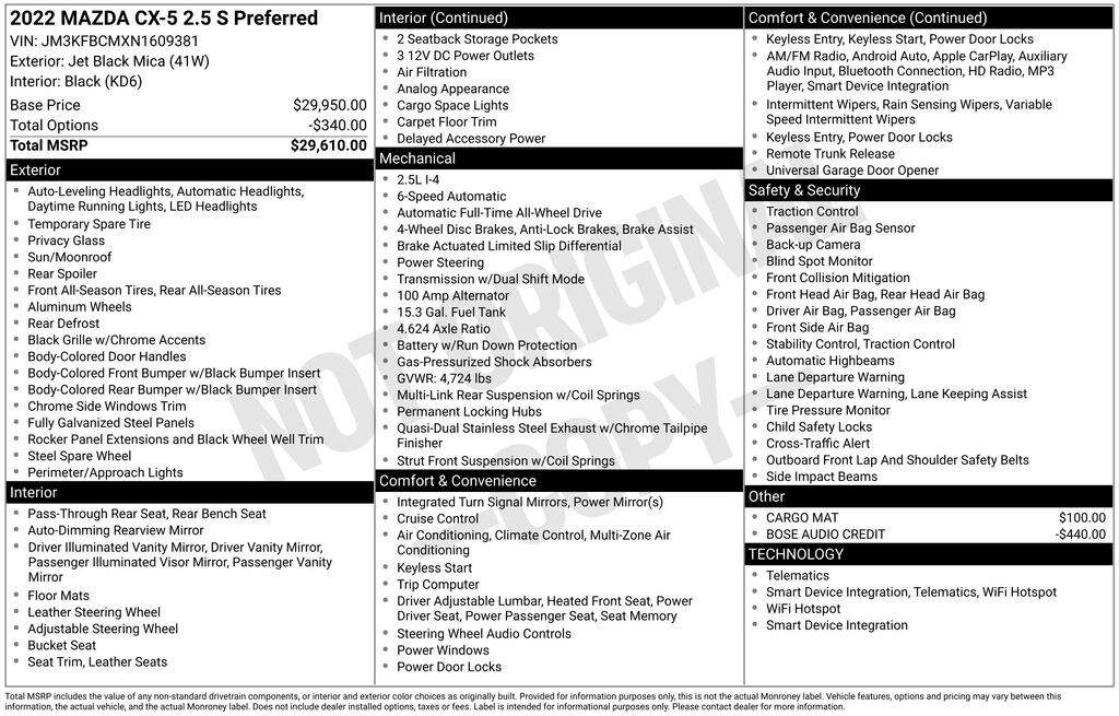 4-Wheel Disc Brakes, 4.624 Axle Ratio, 6 Speakers, ABS brakes, Air Conditioning, Alloy wheels, AM/FM radio, AppLink/Apple CarPlay and Android Auto, Auto High-beam Headlights, Auto-dimming Rear-View mirror, Automatic temperature control, Bose Audio Credit, Brake assist, Bumpers: body-color, Cargo Mat, Delay-off headlights, Driver door bin, Driver vanity mirror, Dual front impact airbags, Dual front side impact airbags, E911 Automatic Emergency Notification, Electronic Stability Control, Emergency communication system: MAZDA CONNECT, Exterior Parking Camera Rear, Four wheel independent suspension, Front anti-roll bar, Front Bucket Seats, Front Center Armrest w/Storage, Front dual zone A/C, Front reading lights, Fully automatic headlights, Garage door transmitter: HomeLink, Heated Front Bucket Seats, Heated front seats, Illuminated entry, Infotainment System Voice Command, Leather Seat Trim, Leather Shift Knob, Low tire pressure warning, Memory seat, Multifunction Commander Control, Occupant sensing airbag, Outside temperature display, Overhead airbag, Overhead console, Pandora, Panic alarm, Passenger door bin, Passenger vanity mirror, Power door mirrors, Power driver seat, Power moonroof, Power passenger seat, Power steering, Power windows, Radio Broadcast Data System Program Information, Radio data system, Radio: AM/FM/HD Audio System, Rain sensing wipers, Rear anti-roll bar, Rear reading lights, Rear seat center armrest, Rear window defroster, Rear window wiper, Remote keyless entry, SMS Text Msg Audio Delivery & Reply, Speed control, Speed-sensing steering, Split folding rear seat, Spoiler, Steering wheel mounted audio controls, Tachometer, Telescoping steering wheel, Tilt steering wheel, Traction control, Trip computer, Turn signal indicator mirrors, Variably intermittent wipers, Wheels: 17" x 7J Aluminum Alloy.
