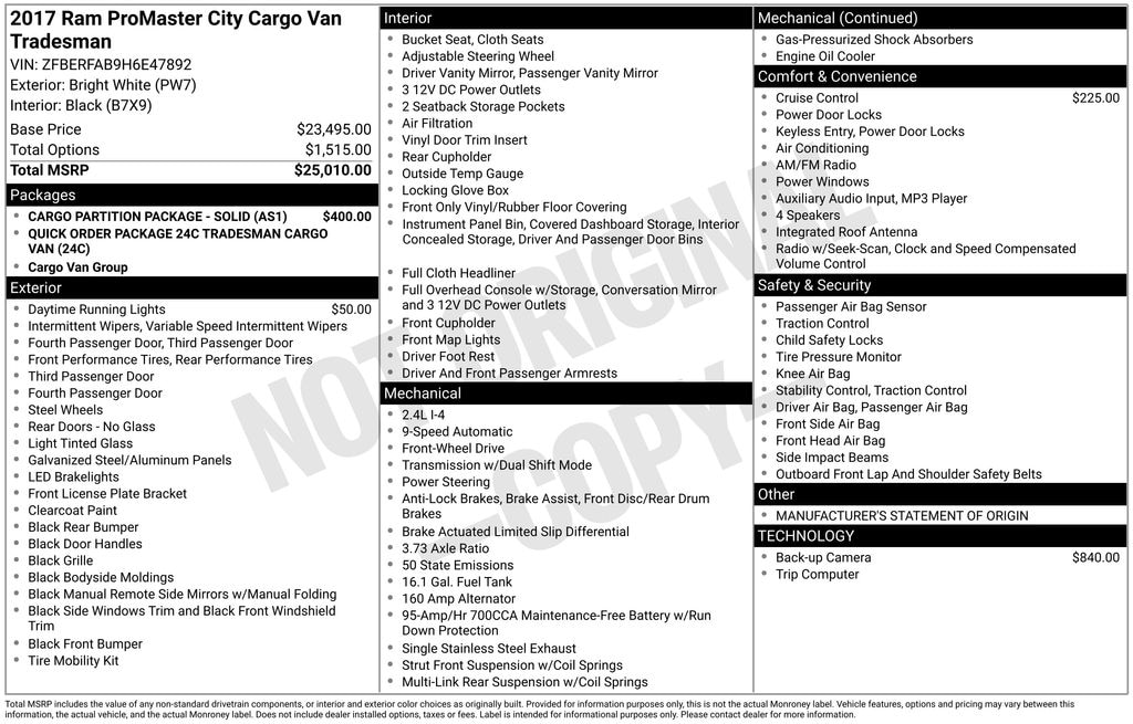 Bright White 2017 Ram ProMaster City Tradesman FWD 9-Speed 948TE Automatic 2.4L I4 MultiAir 3.73 Axle Ratio, 4 Speakers, ABS brakes, Air Conditioning, AM/FM radio, Block heater, Bodyside moldings, Brake assist, Cloth Low-Back Bucket Seats, Daytime Running Headlamps, Delay-off headlights, Driver door bin, Driver vanity mirror, Driver's Seat Mounted Armrest, Dual front impact airbags, Dual front side impact airbags, Electronic Stability Control, Four wheel independent suspension, Front anti-roll bar, Front Bucket Seats, Front reading lights, Heavy Duty Suspension, Illuminated entry, Knee airbag, Low tire pressure warning, Manufacturer's Statement of Origin, Media Input Hub (USB & AUX), MOPAR Backup Camera w/RV Mirror/Monitor, Occupant sensing airbag, Outside temperature display, Overhead airbag, Overhead console, Passenger door bin, Passenger seat mounted armrest, Passenger vanity mirror, Power steering, Power windows, Radio: 3.0, Rear anti-roll bar, Remote keyless entry, Speed Control, Tachometer, Telescoping steering wheel, Tilt steering wheel, Traction control, Trip computer, Variably intermittent wipers, Wheels: 16" x 6.5" Silver Steel.