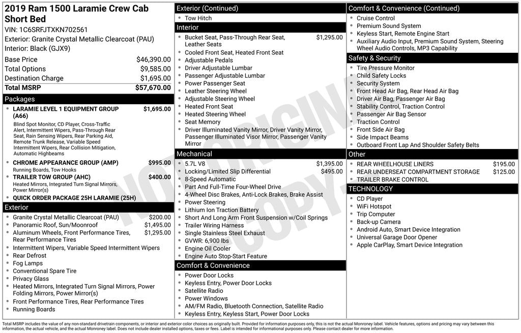 #1 Seat Foam Cushion, 10 Speakers, 3 Rear Seat Head Restraints, 3.21 Rear Axle Ratio, 4 Way Front Headrests, 4-Wheel Disc Brakes, 48V Belt Starter Generator, 8.4" Touchscreen Display, ABS brakes, Adjustable pedals, Air Conditioning, Alloy wheels, AM/FM radio: SiriusXM, Anti-Spin Differential Rear Axle, Apple CarPlay, Apple CarPlay/Android Auto, Audio memory, Auto-dimming door mirrors, Auto-dimming Rear-View mirror, Automatic temperature control, Brake assist, Bumpers: chrome, Chrome Appearance Group, Compass, Delay-off headlights, Dome Dual LED Reading Lamp, Driver door bin, Driver Seat Memory, Driver vanity mirror, Dual front impact airbags, Dual front side impact airbags, Dual-Pane Panoramic Sunroof, Electronic Stability Control, Front anti-roll bar, Front Center Armrest w/Storage, Front dual zone A/C, Front fog lights, Front reading lights, Front Seat Back Map Pockets, Front wheel independent suspension, Fully automatic headlights, Garage door transmitter, Google Android Auto, GPS Antenna Input, Heated door mirrors, Heated Front Seats, Heated front seats, Heated Steering Wheel, Heated steering wheel, Illuminated entry, Integrated Center Stack Radio, Laramie Level 1 Equipment Group, Leather steering wheel, Leather Trim 40/20/40 Bench Seat, LED Dome/Reading Lamp, Low tire pressure warning, Memory seat, Occupant sensing airbag, Outside temperature display, Overhead airbag, Overhead console, Panic alarm, ParkView Rear Back-Up Camera, Passenger door bin, Passenger vanity mirror, Pedal memory, Power 4-Way Driver Lumbar Adjust, Power 4-Way Passenger Lumbar Adjust, Power 8-Way Driver & Passenger Seats, Power Chrome Trailer Tow Mirrors, Power door mirrors, Power driver seat, Power passenger seat, Power steering, Power windows, Quick Order Package 25H Laramie, Radio data system, Radio: Uconnect 4 w/8.4" Display, Rear anti-roll bar, Rear seat center armrest, Rear step bumper, Rear Underseat Compartment Storage, Rear Wheelhouse Liners, Rear window defroster, Remote keyless entry, Security system, Single Disc Remote CD Player, SiriusXM Satellite Radio, Speed control, Split folding rear seat, Steering wheel mounted audio controls, Tachometer, Telescoping steering wheel, Tilt steering wheel, Traction control, Trailer Brake Control, Trailer Tow Group, Trailer Tow Mirrors, Trip computer, Turn signal indicator mirrors, Variably intermittent wipers, Ventilated Front Seats, Ventilated front seats, Voltmeter, Wheel to Wheel Side Steps, Wheels: 18" x 8" Aluminum Base Painted, Wheels: 20" x 9" Premium Paint/Polished.