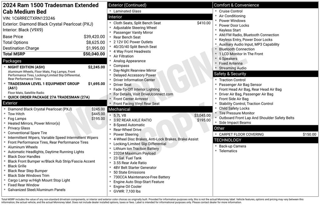 3 Rear Seat Head Restraints, 4 Way Front Headrests, 4-Wheel Disc Brakes, 40/20/40 Split Bench Seat, 48V Belt Starter Generator, 6 Speakers, ABS brakes, Air Conditioning, AM/FM radio, Anti-Spin Differential Rear Axle, Black Exterior Truck Badging, Black Interior Accents, Body Color Front Bumper, Body Color Rear Bumper w/Step Pads, Brake assist, Carpet Floor Covering, Class IV Receiver Hitch, Cloth 40/20/40 Bench Seat, Compass, Delay-off headlights, Driver door bin, Dual front impact airbags, Dual front side impact airbags, Electronic Stability Control, Emergency communication system: RAM Connect, For Details, Visit DriveUconnect.com, For More Info, Call 800-643-2112, Front & Rear Floor Mats, Front anti-roll bar, Front Center Armrest, Front Center Seat Cushion Storage, Front Fog Lamps, Front reading lights, Front wheel independent suspension, Fully automatic headlights, Global Telematics Box Module (TBM), Grille Black Surround Black Mesh, Heated door mirrors, Heavy Duty Vinyl 40/20/40 Split Bench Seat, Illuminated entry, Low tire pressure warning, Manual Adjust 4-Way Driver Seat, Manual Adjust 4-Way Front Passenger Seat, Night Edition, Occupant sensing airbag, Outside temperature display, Overhead airbag, Overhead console, Panic alarm, ParkView Rear Back-Up Camera, Passenger door bin, Passenger vanity mirror, Power door mirrors, Power steering, Power windows, Quick Order Package 27A Tradesman, Radio data system, Radio: Uconnect 3 w/5" Display, RAM Grille Badge - Black, Rear anti-roll bar, Rear Folding Seat, Rear Power Sliding Window, Rear step bumper, Remote keyless entry, SiriusXM Radio Service, SiriusXM Satellite Radio, Speed control, Tachometer, Telescoping steering wheel, Tilt steering wheel, Traction control, Tradesman Level 1 Equipment Group, Variably intermittent wipers, Voltmeter, Wheels: 18" x 7.5" Steel Painted, Wheels: 20" x 9" Cast Aluminum Black.
