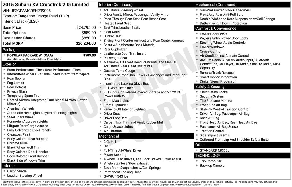 17" x 7.0J Aluminum Alloy Wheels, 3.70 Axle Ratio, 4-Wheel Disc Brakes, 6 Speakers, ABS brakes, Air Conditioning, All Weather Floor Mats, Alloy wheels, AM/FM radio: SiriusXM, Auto-Dimming Mirror w/Compass, Automatic temperature control, Brake assist, Bumpers: body-color, CD player, Driver door bin, Driver vanity mirror, Dual front impact airbags, Dual front side impact airbags, Electronic Stability Control, Exterior Parking Camera Rear, Four wheel independent suspension, Front anti-roll bar, Front Bucket Seats, Front Center Armrest, Front fog lights, Front reading lights, Fully automatic headlights, Heated door mirrors, Heated Front Bucket Seats, Heated front seats, Illuminated entry, Knee airbag, Leather Shift Knob, Leather steering wheel, Low tire pressure warning, MP3 decoder, Occupant sensing airbag, Outside temperature display, Overhead airbag, Panic alarm, Passenger door bin, Passenger vanity mirror, Perforated Leather-Trimmed Upholstery, Popular Package #1, Power door mirrors, Power steering, Power windows, Radio data system, Radio: Subaru Starlink 7.0" Multimedia Plus System, Rear anti-roll bar, Rear Bumper Cover, Rear Seat Back Protector, Rear seat center armrest, Rear Vision Camera, Rear window defroster, Rear window wiper, Remote keyless entry, Roof rack: rails only, Security system, Speed control, Speed-sensing steering, Splash Guards, Split folding rear seat, Spoiler, Standard Model, Steering wheel mounted audio controls, Subaru Starlink Smartphone Integration, Tachometer, Telescoping steering wheel, Tilt steering wheel, Traction control, Trip computer, Turn signal indicator mirrors, Variably intermittent wipers.