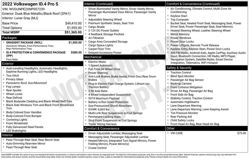 3.90 Axle Ratio, 4 Wheel Independent Suspension, 7 Speakers, ABS brakes, Air Conditioning, Alloy wheels, Auto High-beam Headlights, Auto-dimming Rear-View mirror, Automatic temperature control, Black Roof, Brake assist, Bumpers: body-color, Delay-off headlights, Driver door bin, Driver vanity mirror, Driver's Seat Mounted Armrest, Dual front impact airbags, Dual front side impact airbags, Electronic Stability Control, Emergency communication system: VW Car-Net services (capabilities require enrollment or subscription), EV Roadside Assistance Kit, Exterior Parking Camera Rear, First Aid Kit, Four wheel independent suspension, Front anti-roll bar, Front Bucket Seats, Front dual zone A/C, Front fog lights, Front reading lights, Fully automatic headlights, Gradient Package, Heated door mirrors, Heated Front Seats, Heated front seats, Heated steering wheel, Heavy Duty Trunk Liner w/VW CarGo Blocks, ID.4 Protection & Convenience Package, Illuminated entry, Low tire pressure warning, Memory seat, Navigation System, Occupant sensing airbag, Outside temperature display, Overhead airbag, Overhead console, Panic alarm, Passenger door bin, Passenger seat mounted armrest, Passenger vanity mirror, Perforated V-Tex Leatherette Seating Surfaces, Power door mirrors, Power driver seat, Power Liftgate, Power passenger seat, Power steering, Power windows, Radio data system, Radio: Discover Pro Max w/12" Touchscreen Nav, Rain sensing wipers, Rear anti-roll bar, Rear reading lights, Rear seat center armrest, Rear window defroster, Rear window wiper, Remote keyless entry, Roof rack: rails only, Rubber Mats Kit (Set of 4), Silver Accents on Front & Rear Bumpers, Speed control, Speed-sensing steering, Split folding rear seat, Spoiler, Steering wheel mounted audio controls, Telescoping steering wheel, Tilt steering wheel, Traction control, Trip computer, Turn signal indicator mirrors, Variably intermittent wipers, VW Care, Wheels: 19" 5-Spoke 2-Tone Machined Alloy, Wheels: 20" Dynamic Design Machined Alloy.